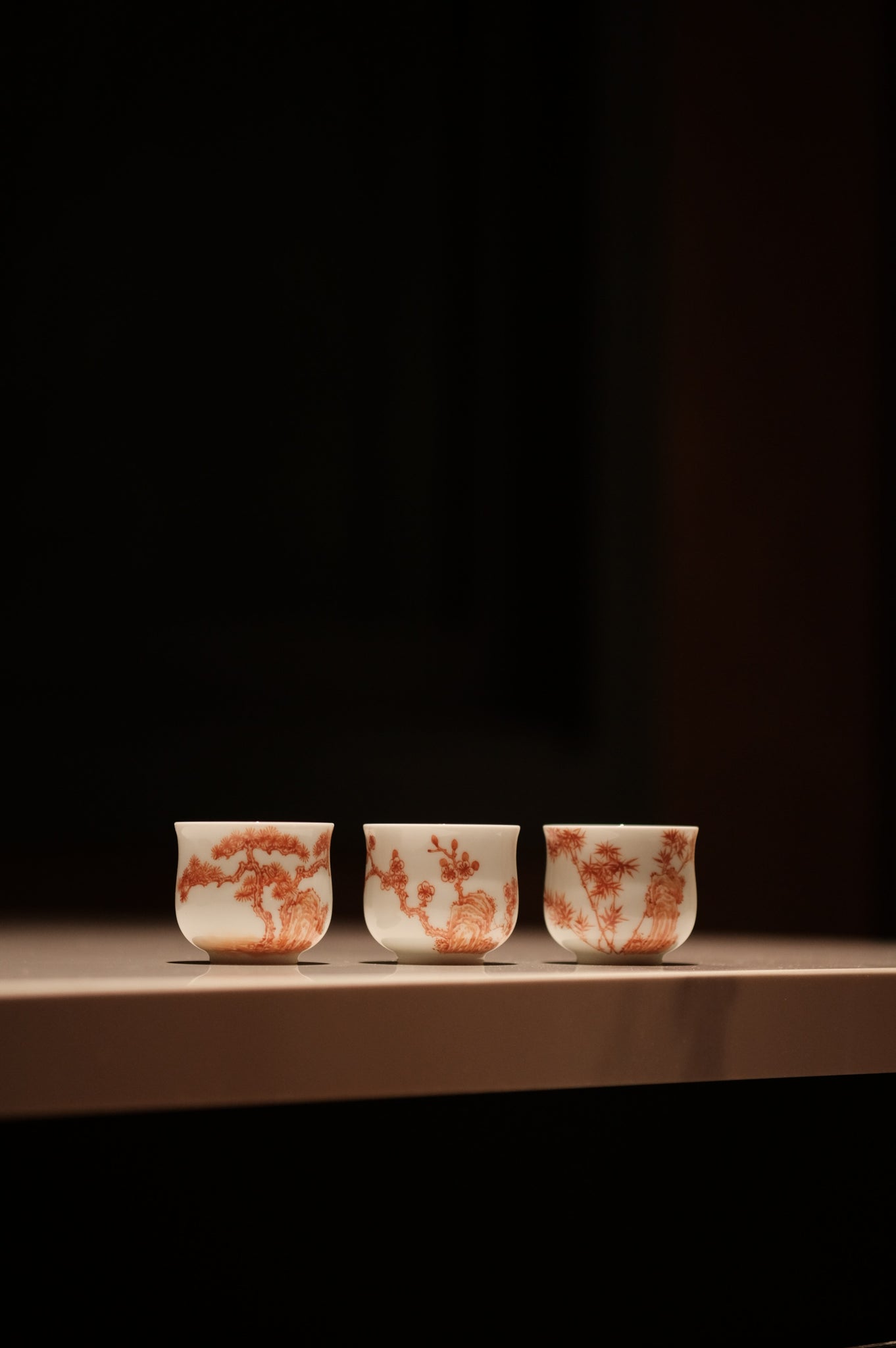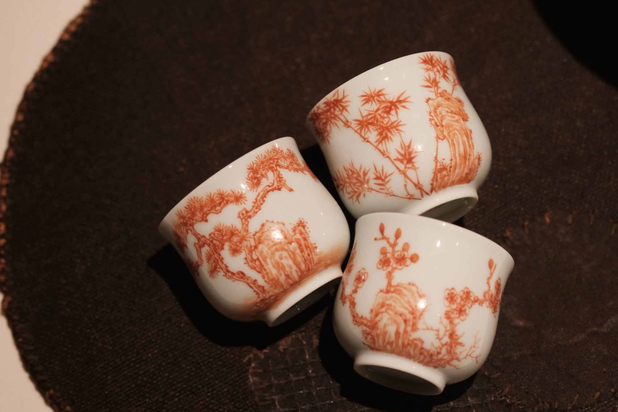 The soul of these cups lies in the meticulous craftsmanship of traditional cinnabar-red painting, a centuries-old overglaze enamel technique dating back to the Ming and Qing dynasties. Every step embodies the warmth of handcrafting. In selecting the clay, artisans choose high-white porcelain clay, which is first fired at over 1300°C to create a dense, translucent body with a glaze as smooth and lustrous as suet jade. This provides a pristine canvas for the cinnabar-red pigment, enhancing its vibrancy and depth. Preparing the cinnabar-red pigment involves using natural mineral raw materials, which are ground repeatedly, finely washed, and precisely proportioned to create a smooth, paste-like consistency. The resulting hue is warm and gentle, with a vermilion undertone that resists fading even with the passage of time. The painting process demands the greatest skill: senior artists use fine brushes to hand-draw the patterns of pine, bamboo, and plum, stroke by stroke. The ruggedness of pine needles, the uprightness of bamboo branches, and the delicate sparseness of plum blossoms all come to life under the brush, free from the rigidity of machine printing. Each cup is a unique work of art, an irreplicable original. After painting, the cups undergo a second low-temperature firing at around 800°C, fusing the cinnabar-red pigment firmly with the glaze. The finished color is rich and glossy, and a light touch of the finger reveals a fine, textured relief, adding layers of sensory delight.