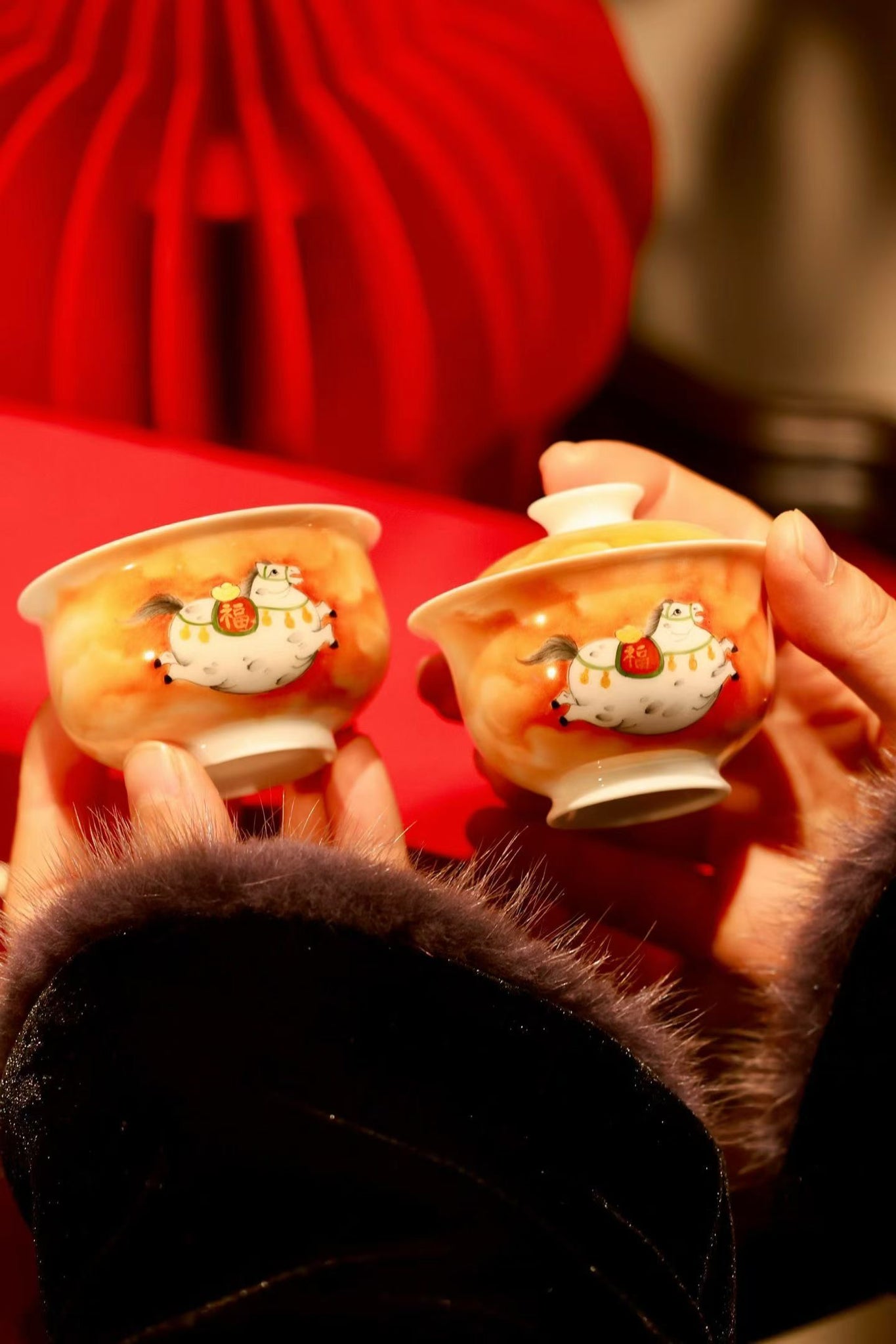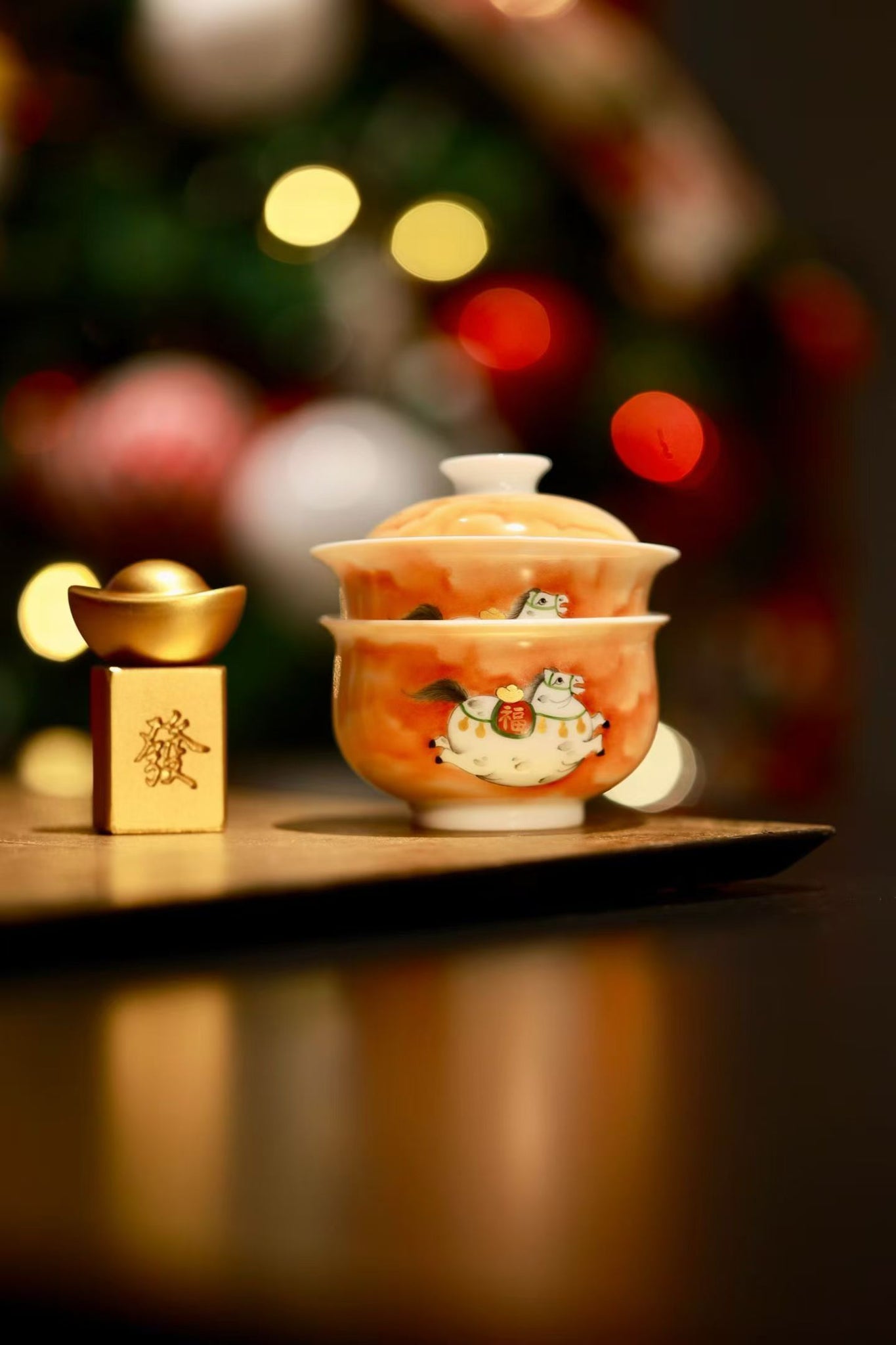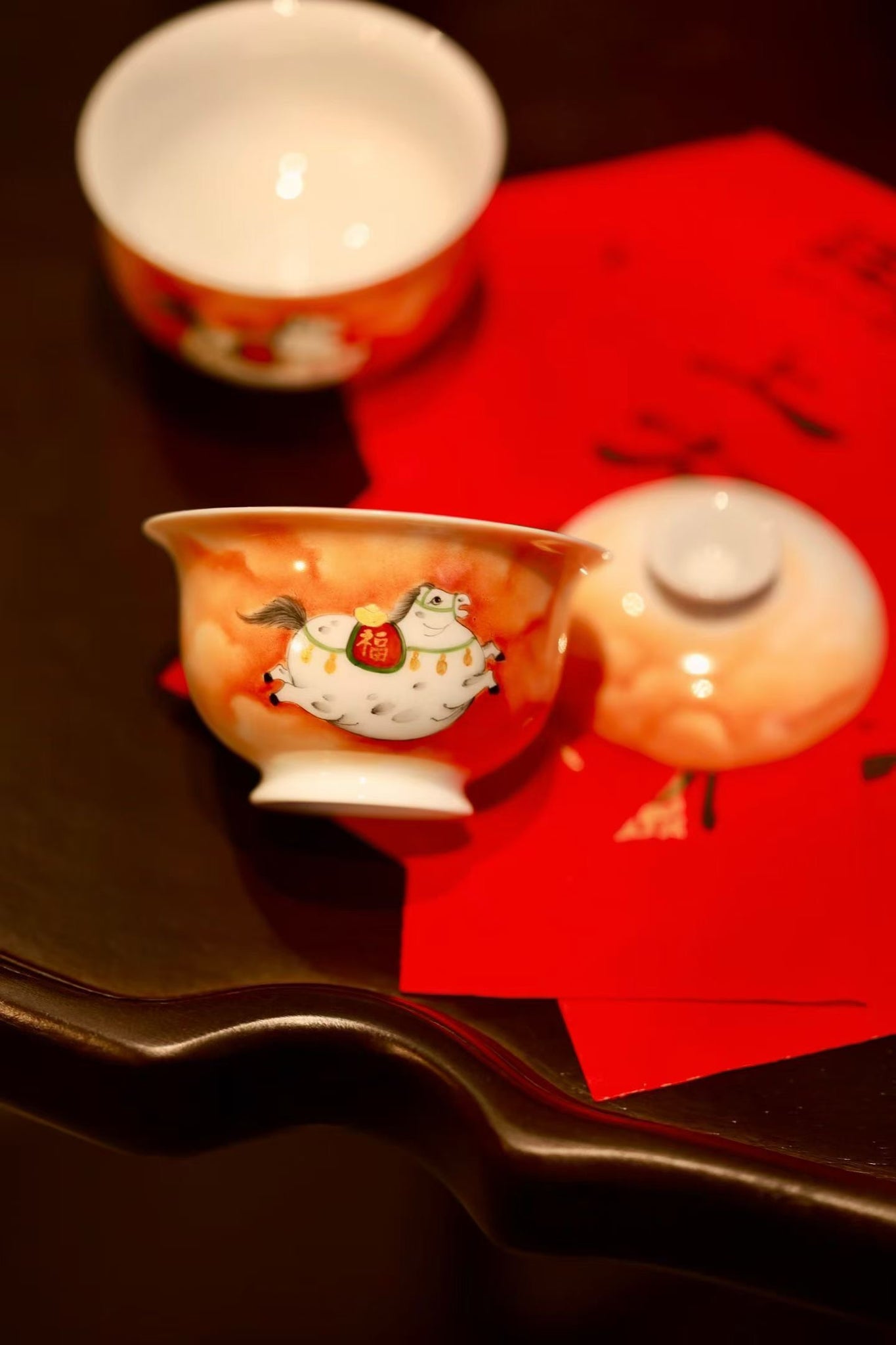 As a limited-edition New Year set, the "stackable" design holds thoughtful details. The gaiwan and matching tea caddy nestle perfectly into one another, saving space while creating a striking display that evokes the image of a steed galloping through clouds—an auspicious symbol of "rising higher and gathering blessings step by step". Wrapped in a rich vermilion box, adorned with gold foil engravings of galloping horses and the Chinese calligraphy for "Good Fortune on the Horizon", the packaging exudes festive warmth and refined elegance the moment you open it. Whether placed on your tea table to add a touch of New Year cheer or gifted to loved ones, it conveys a dual blessing: "May you forge ahead like a bold steed, and savor the quiet joy of solitude".