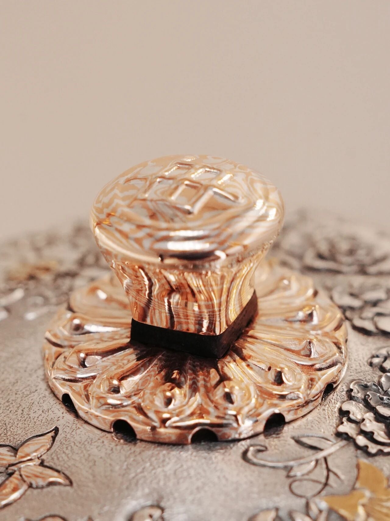 The "Thousand Flowers Beam Pot" brought by Tongxinshe Teahouse this time is a masterpiece that embodies Master Mu Binglin's ingenuity. The pot body is made of 9999 fine silver as the framework, supplemented by wood-grain gold and gold decorations, integrating multiple complex techniques such as wood-grain gold, forging, chiseling and inlaying. With a capacity of 1000ml/570g ,it is not only suitable for daily tea tables but also appears grand and dignified. Its design ingenuity lies in every detail: the pot body is formed by forging, and the body is chiseled with a belt of winding thousands of flowers. There are graceful peonies, chrysanthemums hiding autumn frost, roses with dewdrops, elegant lilies, as well as sunflowers, camellias, crabapples, plums, peaches, lotuses, chrysanthemums and hydrangeas complementing each other. The beauty of hundreds of flowers in four seasons is integrated into one vessel, which exactly corresponds to the beautiful meaning of "Thousands of flowers are not vulgar, and prosperity never ends". On the pot lid, butterflies play among the flowers, vivid and lively, echoing the flower belt on the pot body from afar, forming a natural charm. The beam and the pot knob are exquisitely made with the master's representative wood-grain gold technique, which not only highlights the unique aesthetics but also makes the overall temperament elegant and extraordinary.