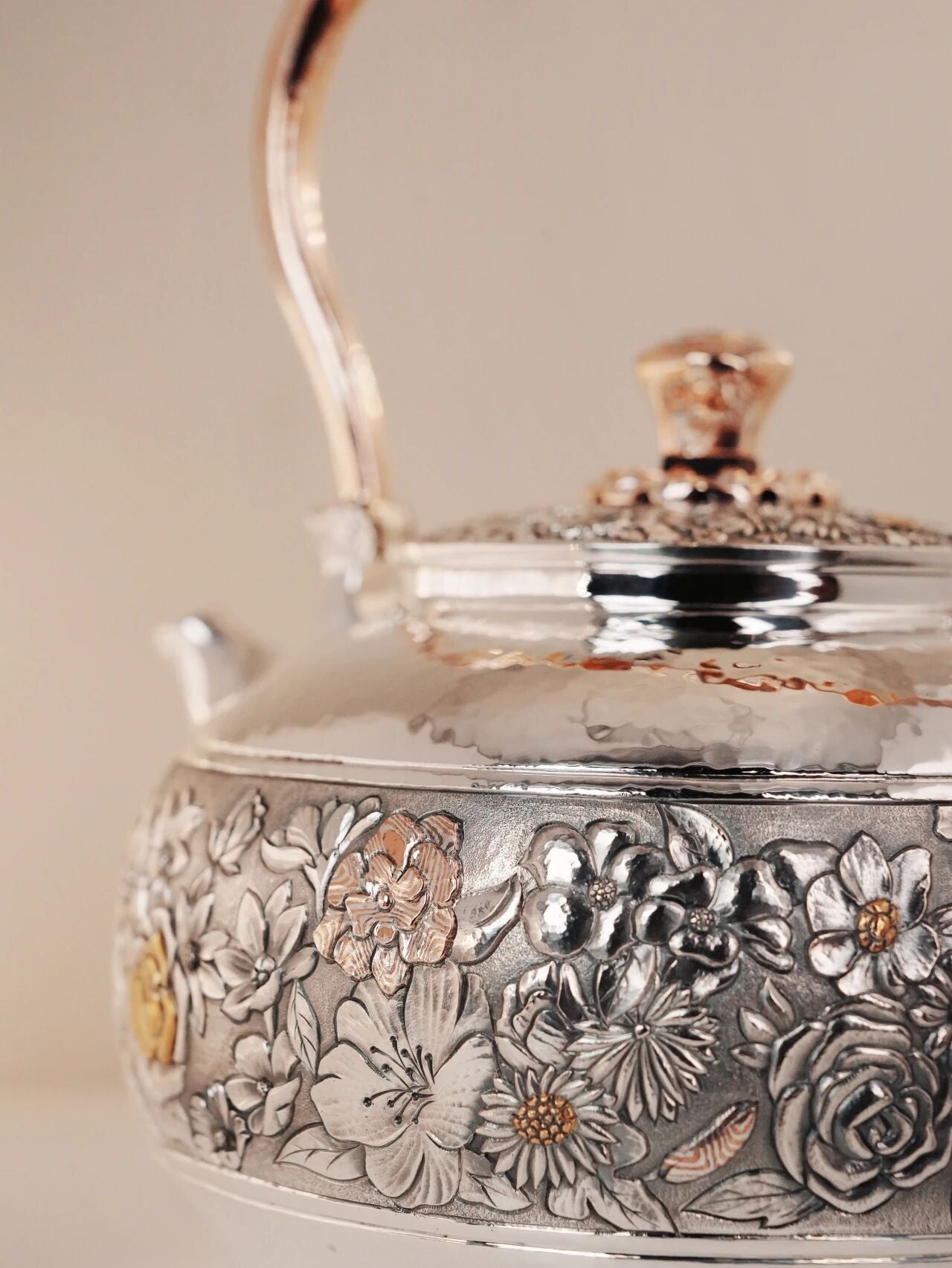 This "Thousand Flowers Beam Pot" is a vivid carrier of intangible cultural heritage techniques, the ultimate presentation of the master's ingenuity, and a rare treasure in tea utensil collection. It can accompany daily tea ceremonies, improving the texture of tea soup with the purity of silver and the elegance of the vessel; it can also be carefully collected as a treasure, carrying the cultural heritage of thousands of years of craftsmanship and the scarce value of the master's handiwork, making this ingenuity of "endless prosperity" more precious over time.
