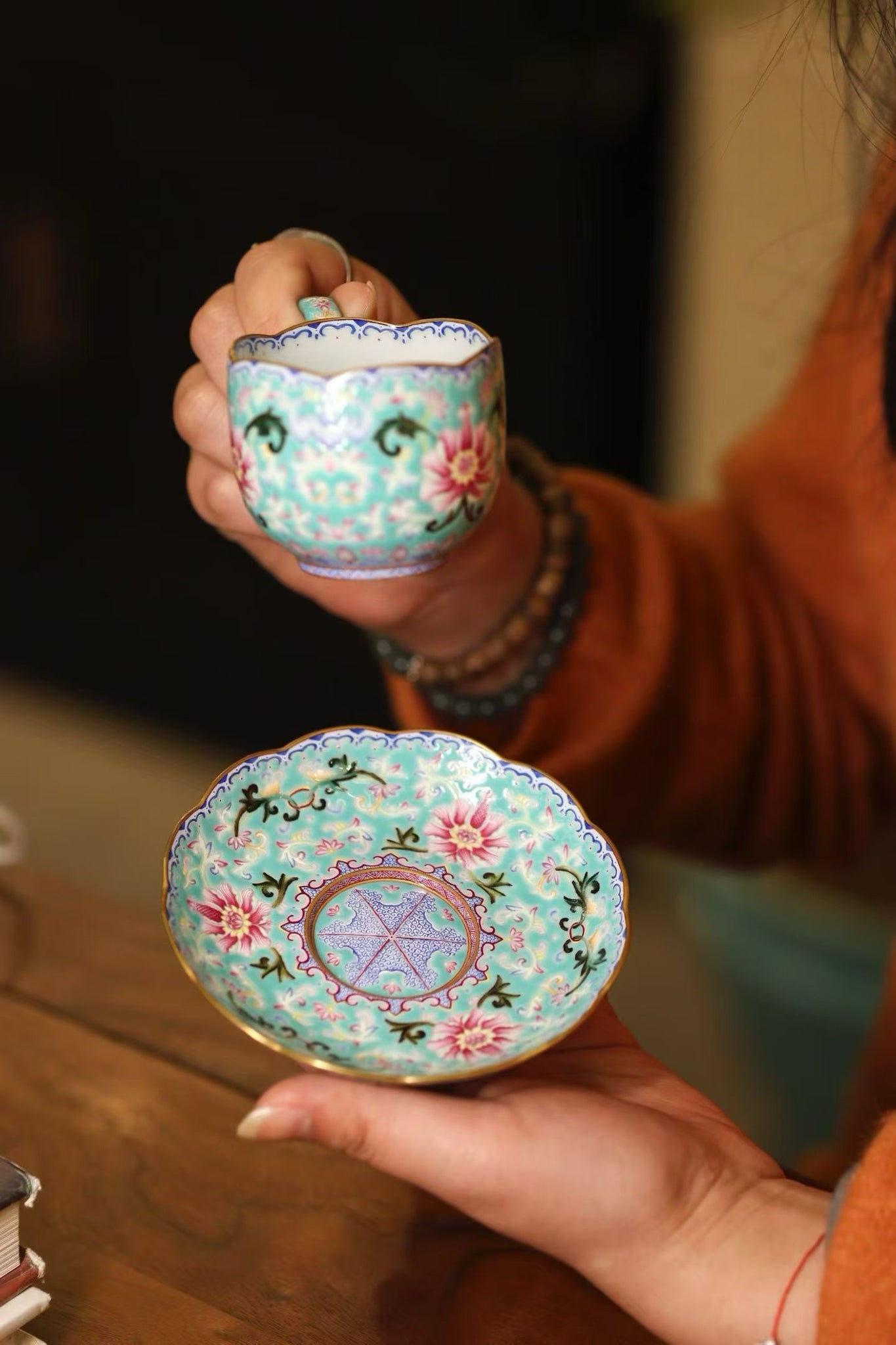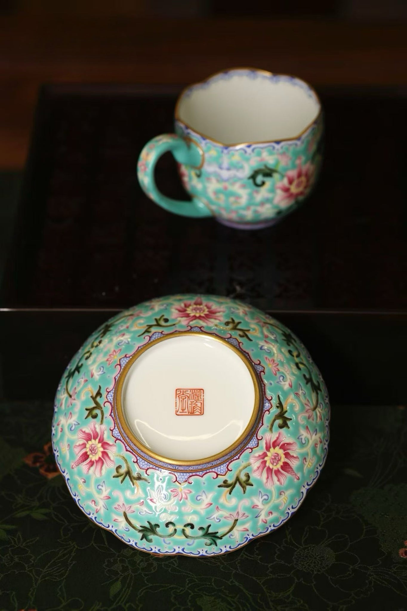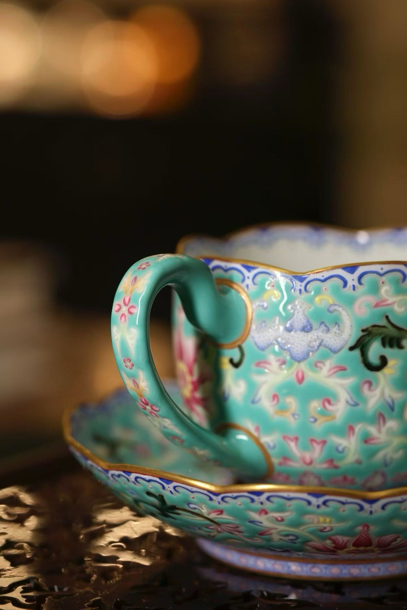 The moment a vessel meets tea, a tea table gains its soul. With years of dedication to tea culture, Tongxin She has always upheld strict standards in curating tea wares, ensuring each piece embodies the beauty of Oriental craftsmanship while fitting seamlessly into modern living. We are pleased to present the Yizhen Tang Turquoise-Ground Flower-Edge Cup & Saucer Set with Rolled Floral Pattern, bringing the exquisite craftsmanship of the Qianlong imperial kiln of the Qing Dynasty into your daily tea and coffee moments, letting court elegance settle gently into ordinary life.
