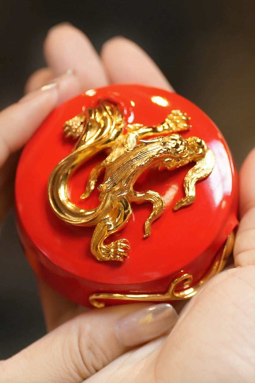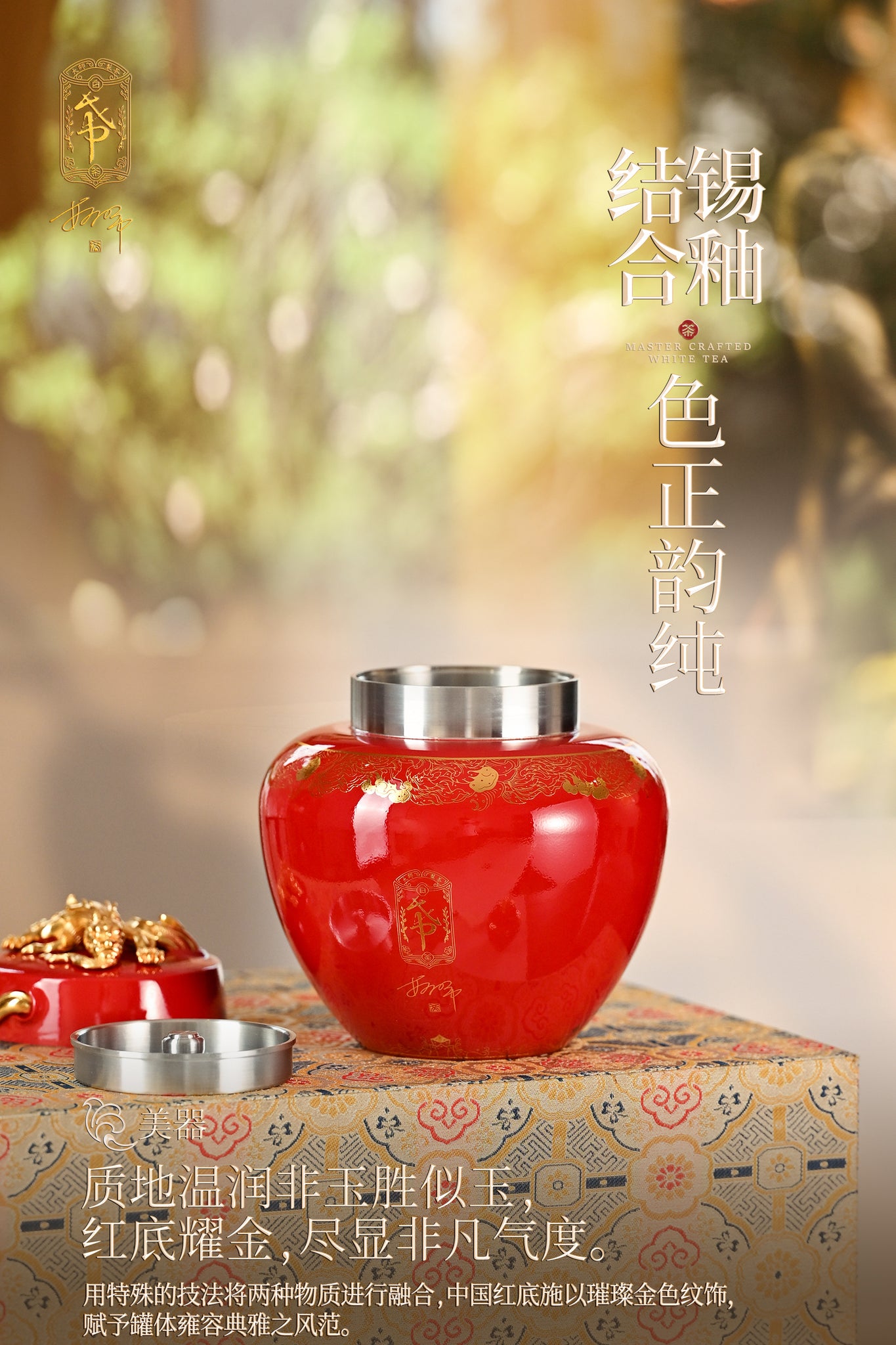 Master Lai Qingguo, an Outstanding Craftsman of Forbes China and representative inheritor of tinware production techniques, designed this Qin-Han Emperor Jar with meticulous craftsmanship. Inspired by the imperial utensils of the Qin and Han dynasties, the jar features a swollen belly and broad shoulders, exuding a majestic momentum within its compact size. Crafted from high-purity tin, it is airtight, dry, and odorless—an ideal container for preserving tea fragrance. Through the changes of seasons, it steadfastly guards the tea's mellow charm. The jar adopts glazed gilding craftsmanship, with red base and golden patterns complementing each other: the dragon patterns on the base symbolize authority, while the river cliff and sea water patterns represent enduring foundations, radiating profound ancient charm. The lid is adorned with a copper-gilded embossed coiled dragon, imposing and powerful, implying the "dragon hiding in the abyss"—a metaphor for latent strength. The integration of tin and glaze creates a texture as warm and smooth as jade, even surpassing jade in elegance. Accompanied by a brocade box with ruyi and interlocking patterns, the jar is not only a practical tea storage container for the tea table but also an ornamental piece for the desk or a portable tea caddy—collectible as a decorative artwork, functional as a tea storage tool, embodying both aesthetic and practical value.