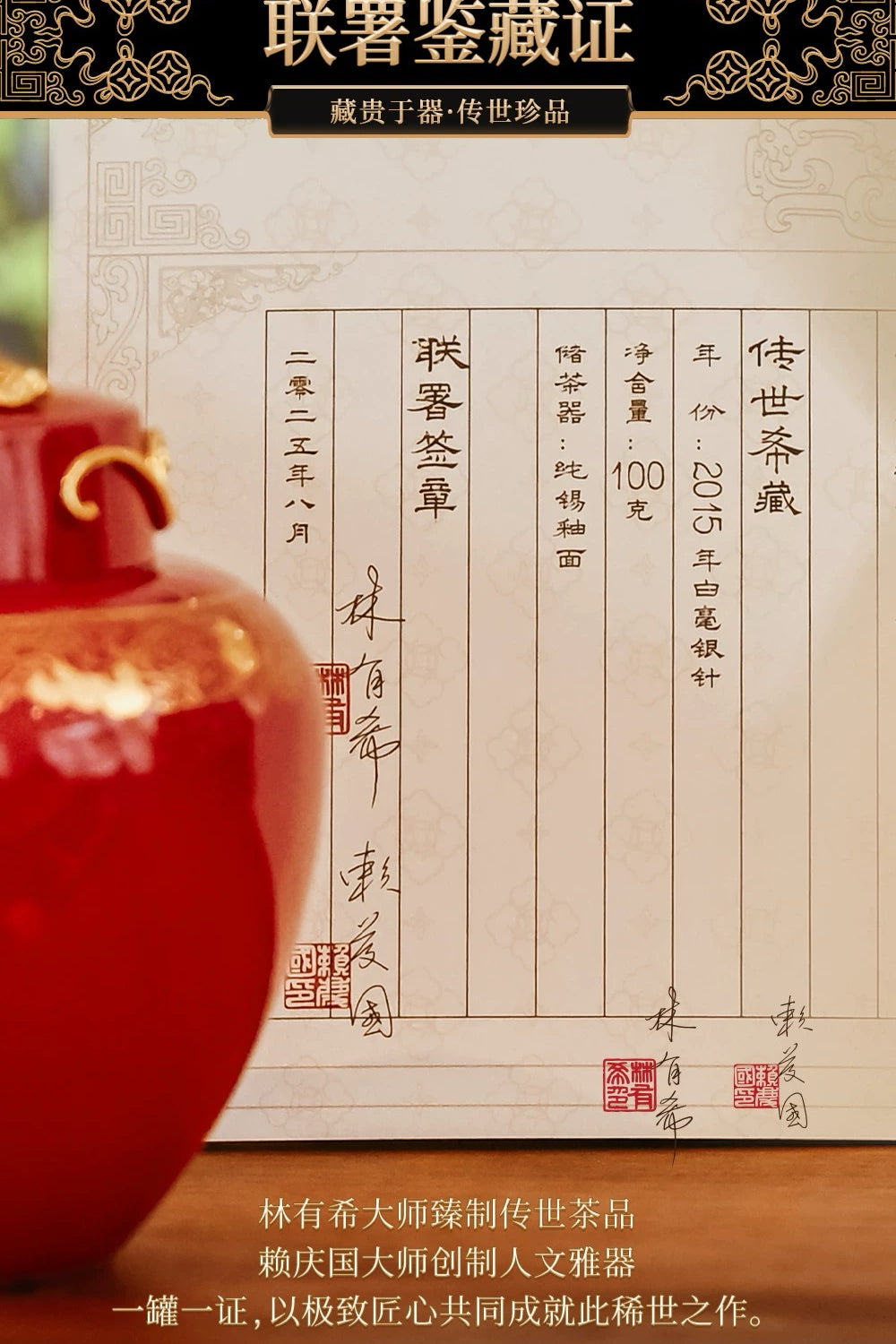 When the natural purity of Fuding white tea meets the time-honored craftsmanship of tinware, Tongxin She Teahouse proudly presents this co-branded limited masterpiece—a cross-border collaboration between Lin Youxi, Master of Chinese Tea Making, and Lai Qingguo, Master of Chinese Arts and Crafts. With the 2015 Baihao Yinzhen and 2004 Laoshoumei as the soul, and the Qin-Han Emperor Jar as the vessel, each set comes with a unique certification, embodying the oriental elegance of tea and utensil, and boasting both drinking and heirloom value.