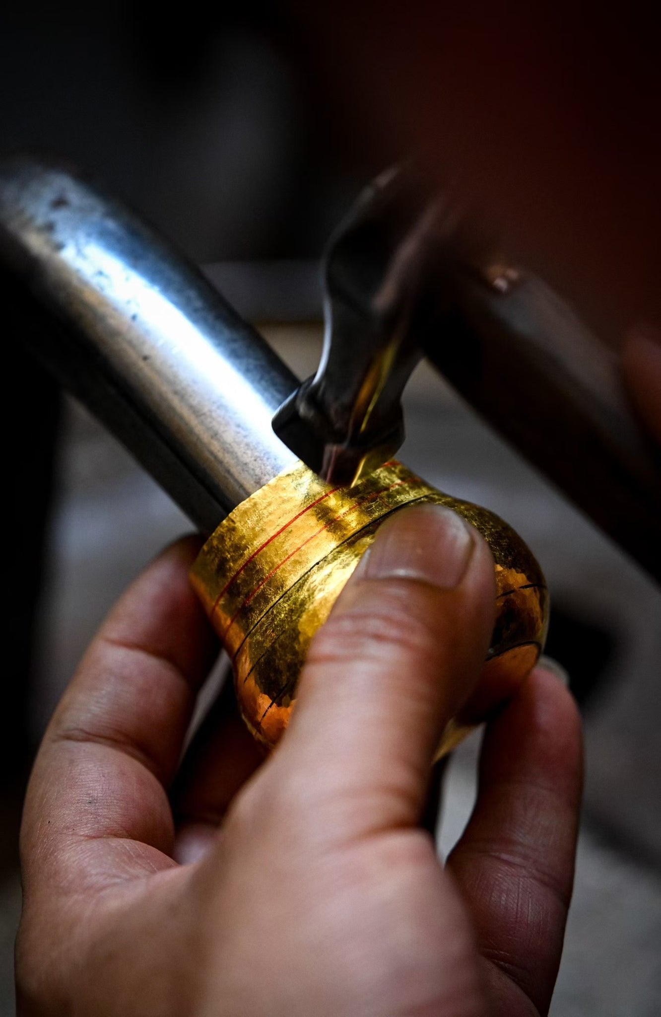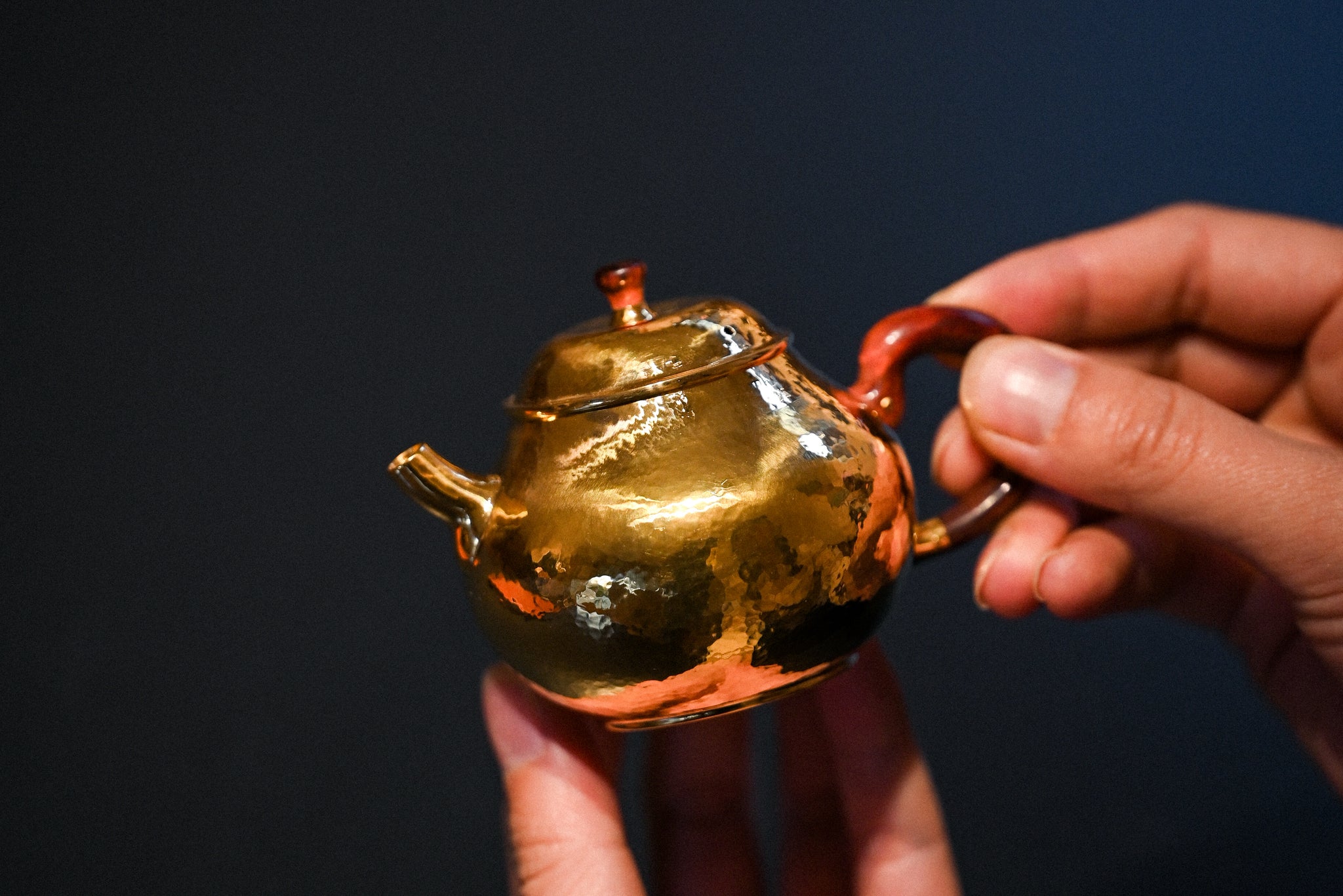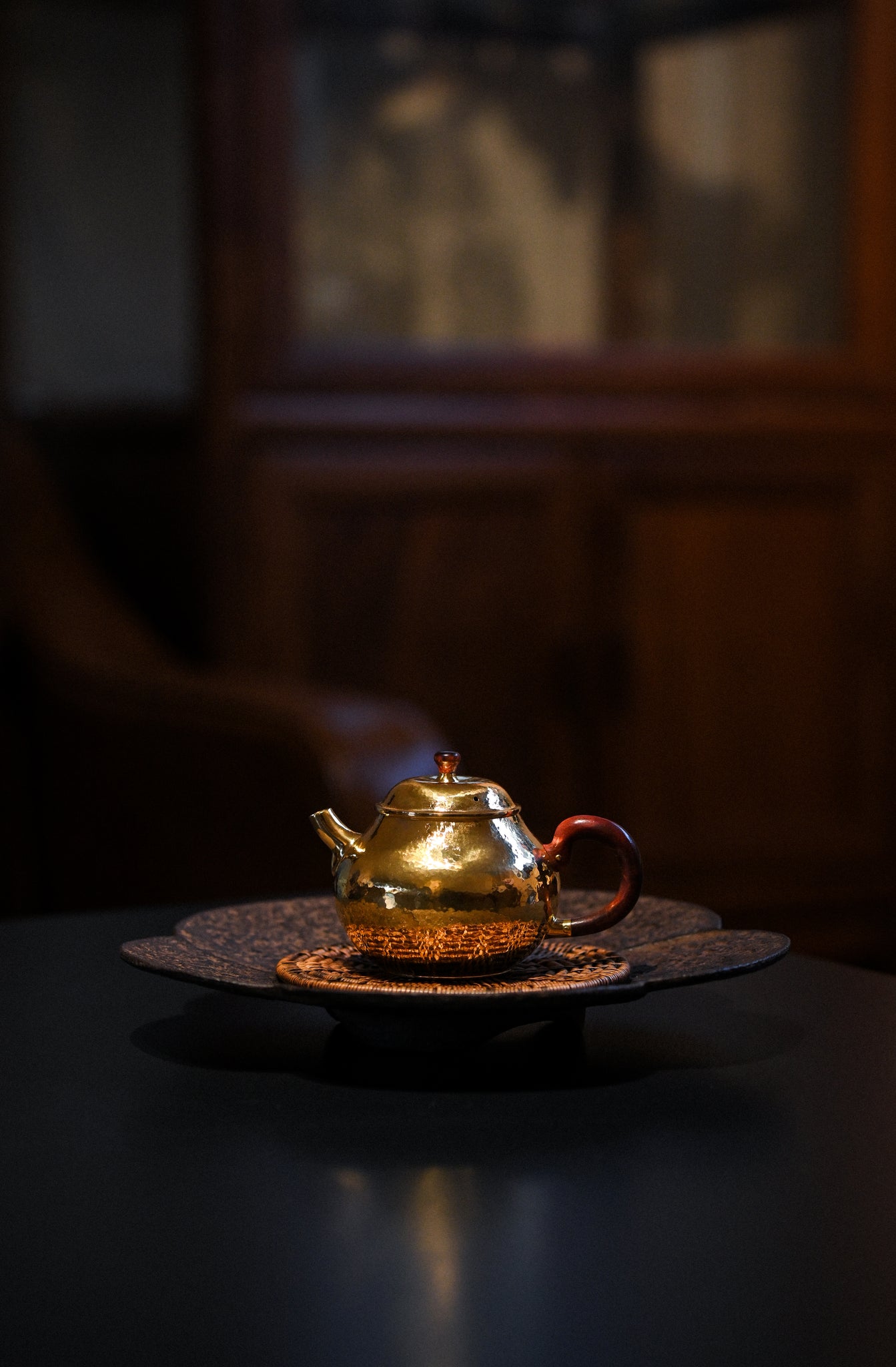 The teapot’s one-of-a-kind handcrafted nature endows it with irreplaceable collection value. From gold melting, forging, shaping to polishing, 36 intangible cultural heritage processes are meticulously executed by seasoned artisans. Its unique hammered texture and artisanal traces make it "the only one of its kind in the world," ensuring exceptional scarcity. Crafted from 120g of high-purity gold, it boasts both value preservation and appreciation properties; its chemical stability allows it to withstand centuries without corrosion, serving as both a high-end collection today and a "heirloom treasure" for future generations, carrying dual material and spiritual value. What sets it apart is its ability to transcend the decorative nature of pure gold artifacts, seamlessly integrating tea ceremony aesthetics with goldsmithing craftsmanship. The exquisite 100cc capacity is specifically designed for tasting high-end white tea and rock tea, achieving the ultimate balance between practicality and artistry — a benchmark work in contemporary tea utensil collection.
