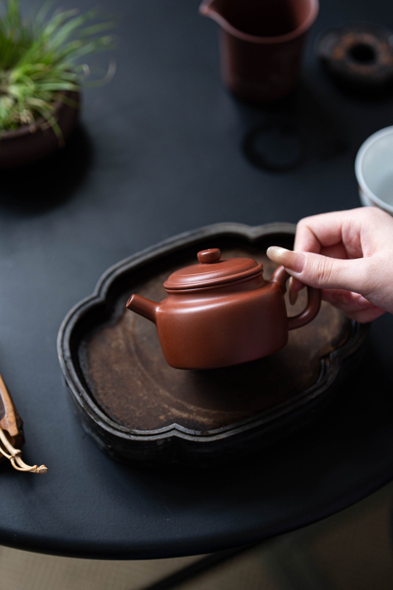 This top-grade Huanglongshan Red Skin Dragon Dezhong Zisha teapot, newly launched at Tongxin She Teahouse, is handcrafted by the artisan Wu Yingjie, faithfully following ancient traditions. Simple and elegant, without excessive ornamentation, it is made with a spirit of humility and restraint. The curve of the body may seem unchanging, yet subtle contours and transitions reveal masterful control and profound skill. Sourced from Huanglong Mountain in Yixing, this teapot is fired at approximately 1160–1200°C and has a capacity of 140cc — a modest, comfortable size ideal for personal or shared tea sessions. It suits an extremely wide range of teas: most excellent for raw Pu’er, and equally capable with ripe Pu’er, oolong, black tea, and other varieties, stabilizing aromas and enhancing richness, resulting in warm, full-bodied liquor.