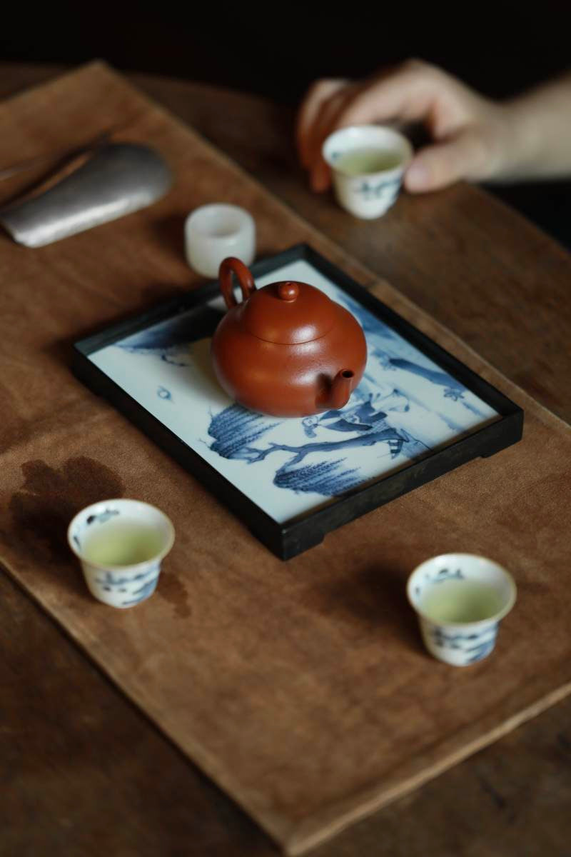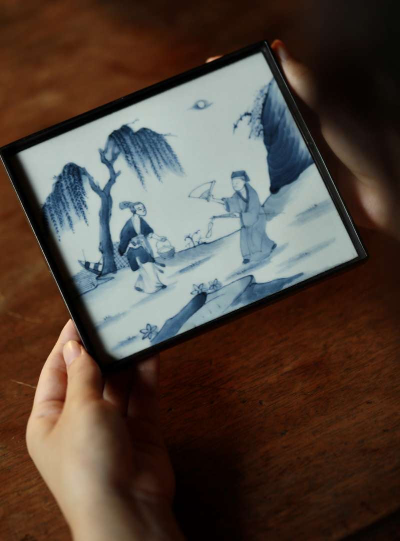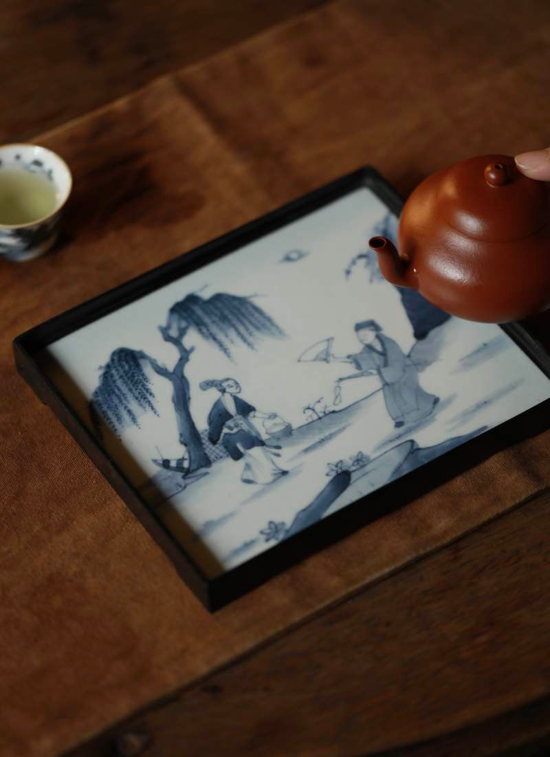 The core of the teapot stand is a hand-painted blue-and-white porcelain plate. The painter uses blue-and-white pigment with varying shades to lay out a scene full of earthly charm: willows are slender, the moon is hazy, ancients either invite each other with fans or walk slowly with baskets. Details of plants, flowers, rocks and paths are vividly presented within this small space. This hand-painted blue-and-white craftsmanship inherits the freehand charm of Ming and Qing porcelain paintings — the lines are as smooth as flowing clouds, the layers of rendering are distinct, and each stroke is a tribute from the craftsman to traditional aesthetics. The blue of the blue-and-white porcelain becomes more elegant on the white porcelain base, as if condensing the haziness of Jiangnan misty rain and the subtlety of ancient people's thoughts into this porcelain surface, adding a touch of literati interest that is "appreciable, tastable and memorable" to the tea mat.