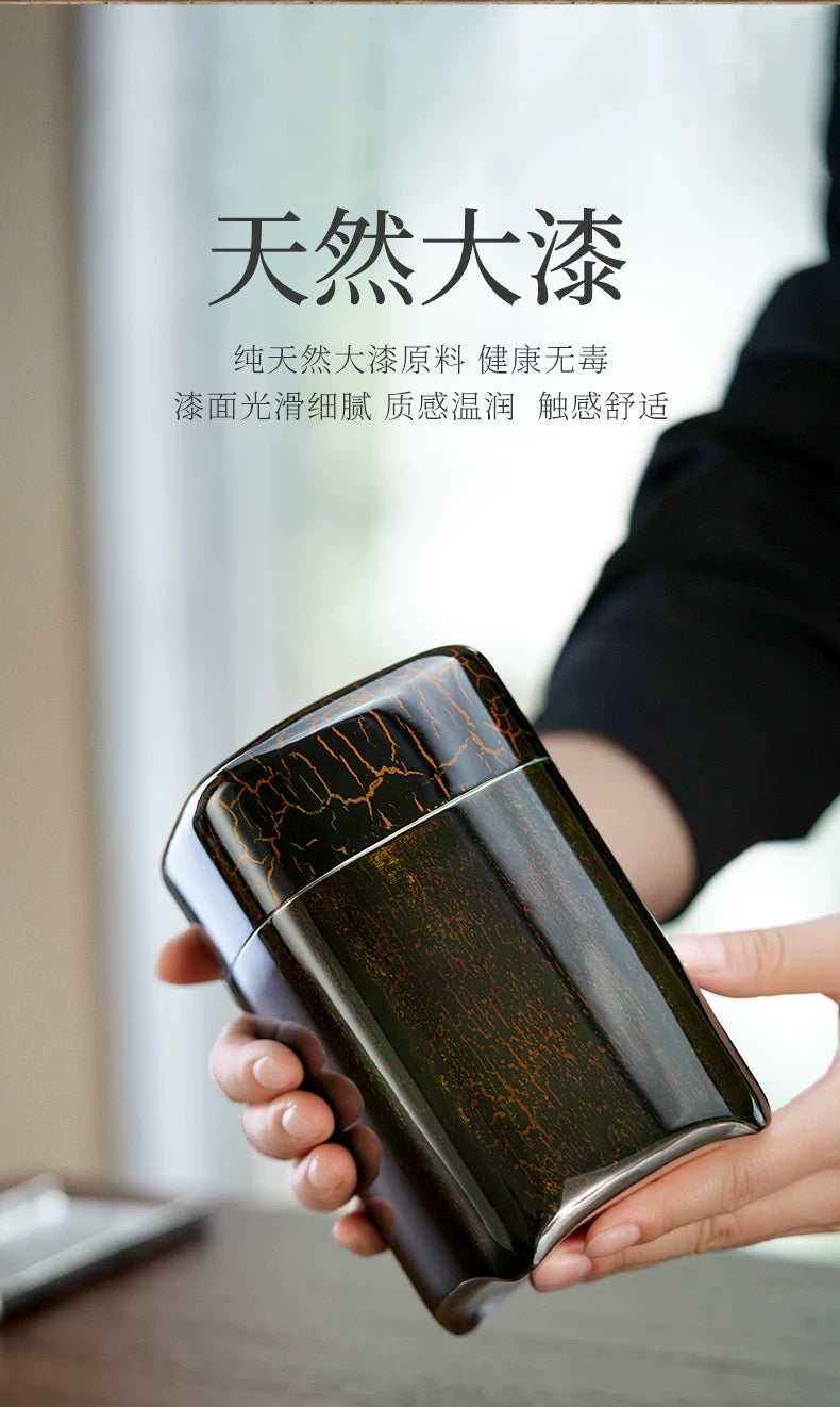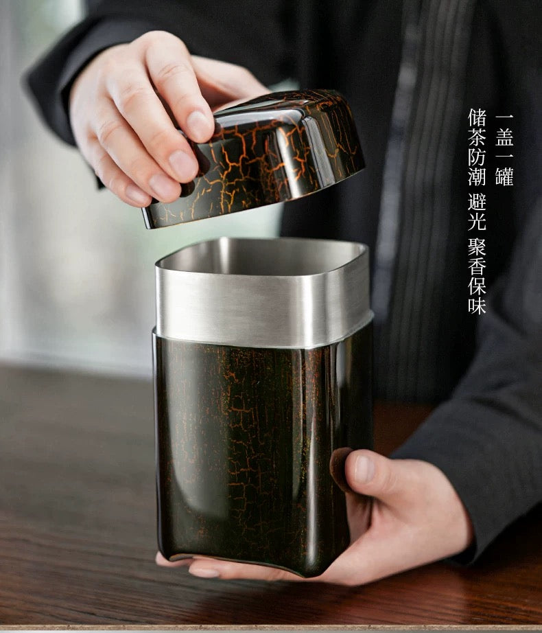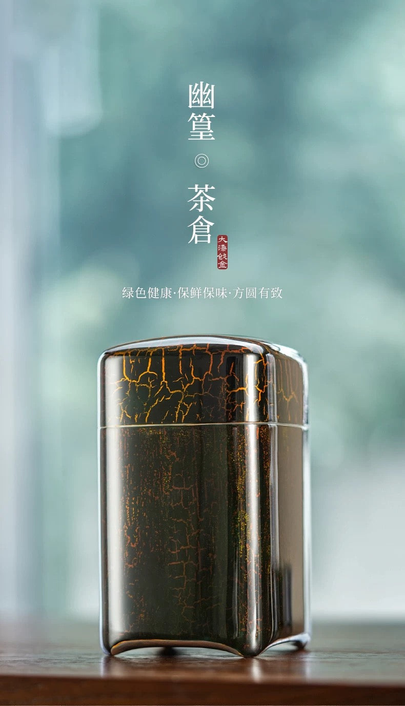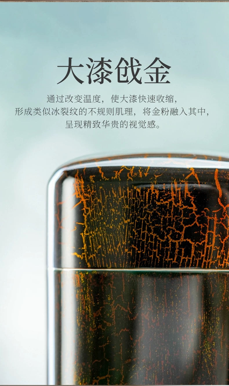 In terms of materials, it takes pure tin as the skeleton and lacquer as the coating. "Tin is suitable for all kinds of tea." Pure tin naturally has excellent fresh-keeping properties: it can isolate moisture, avoid light and sun, and maintain the original aroma and ingredients of tea for a long time. Whether it is Tieguanyin (about 290g), or rock tea, Dan Cong, Longjing, Silver Needle, and White Peony (about 145g), they can all be properly stored in the Youhuang Tea Caddy. One lid and one caddy achieve the ultimate tea storage requirements of moisture-proof, light-proof, aroma-concentrating, and flavor-preserving. The caddy body adopts natural lacquer craftsmanship, using natural raw materials from lacquer trees, which are healthy and non-toxic. The lacquer surface is smooth and delicate, with a温润 and comfortable touch, making it a "living craft" that becomes more charming over time. What's even more amazing is the "lacquer inlay with gold" technique: by controlling the temperature to make the lacquer shrink rapidly, an irregular texture similar to ice cracks is formed, and then gold powder is incorporated into it — the golden lines spread like a spider web on the dark brown background, as if there is light flowing in the cracks, creating a delicate and luxurious visual effect. Each texture is a unique artistic mark.