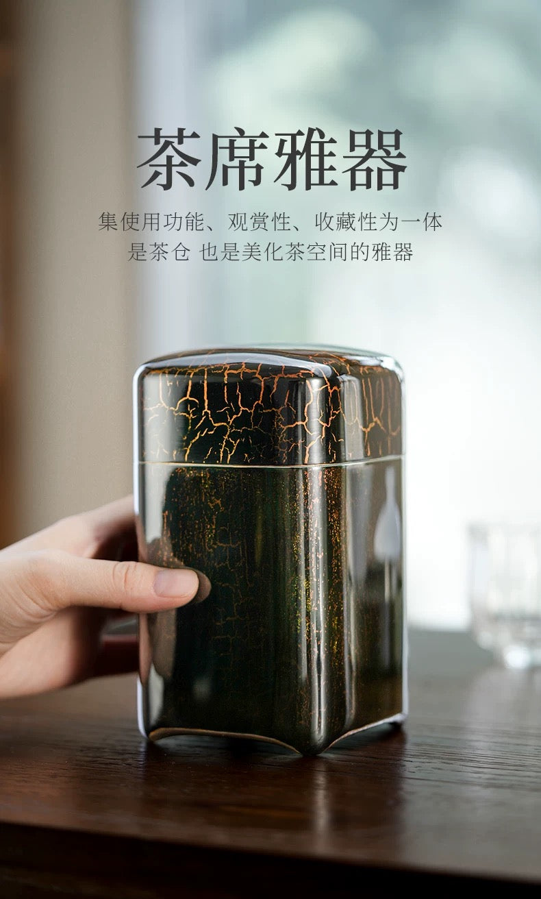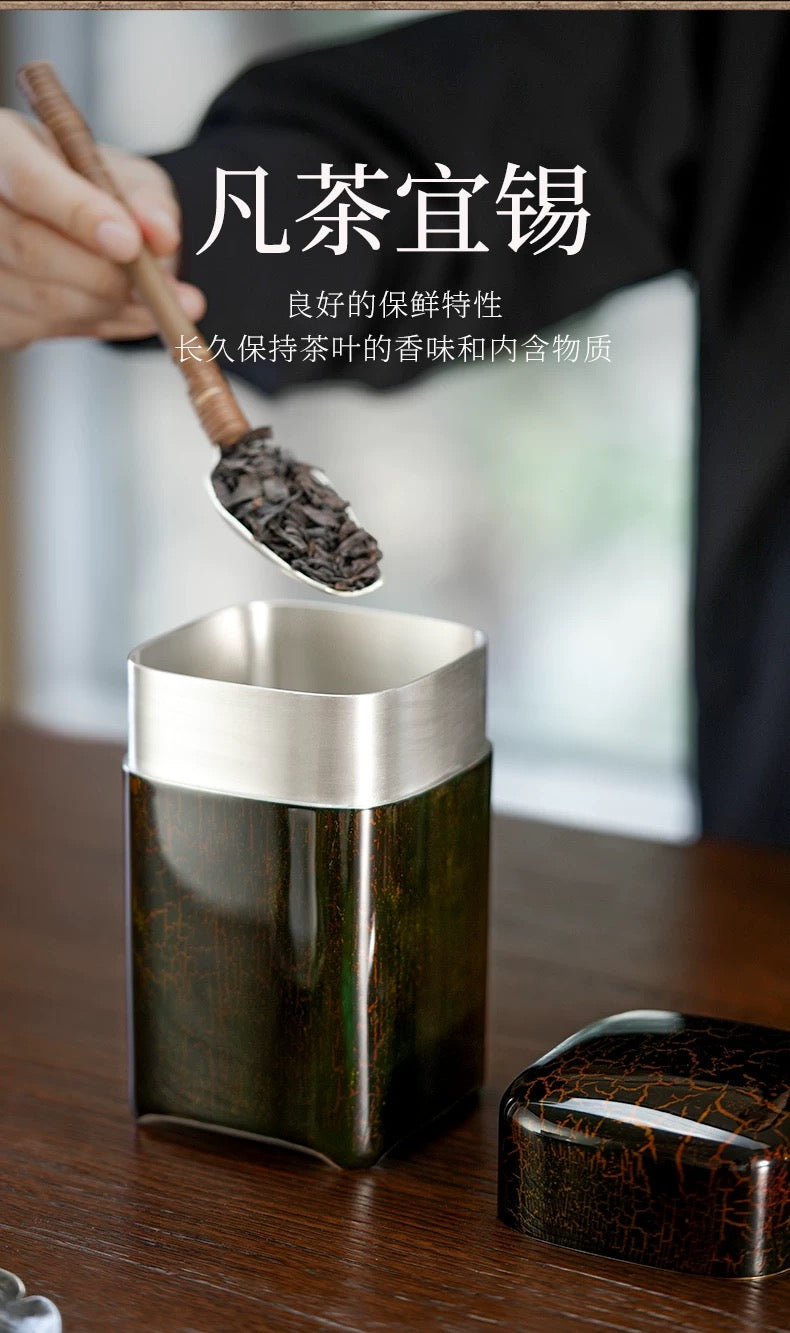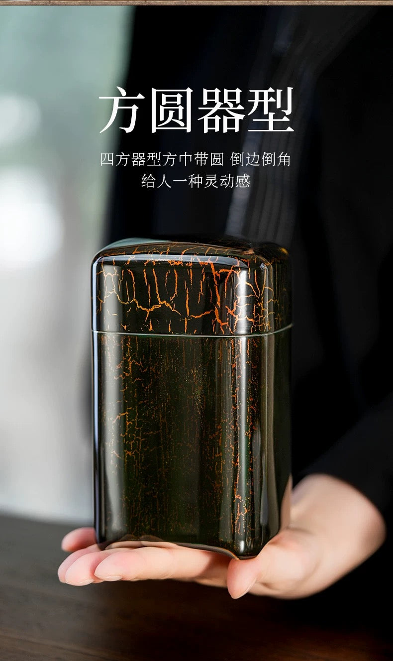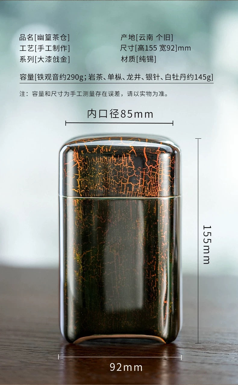 In terms of materials, it takes pure tin as the skeleton and lacquer as the coating. "Tin is suitable for all kinds of tea." Pure tin naturally has excellent fresh-keeping properties: it can isolate moisture, avoid light and sun, and maintain the original aroma and ingredients of tea for a long time. Whether it is Tieguanyin (about 290g), or rock tea, Dan Cong, Longjing, Silver Needle, and White Peony (about 145g), they can all be properly stored in the Youhuang Tea Caddy. One lid and one caddy achieve the ultimate tea storage requirements of moisture-proof, light-proof, aroma-concentrating, and flavor-preserving. The caddy body adopts natural lacquer craftsmanship, using natural raw materials from lacquer trees, which are healthy and non-toxic. The lacquer surface is smooth and delicate, with a温润 and comfortable touch, making it a "living craft" that becomes more charming over time. What's even more amazing is the "lacquer inlay with gold" technique: by controlling the temperature to make the lacquer shrink rapidly, an irregular texture similar to ice cracks is formed, and then gold powder is incorporated into it — the golden lines spread like a spider web on the dark brown background, as if there is light flowing in the cracks, creating a delicate and luxurious visual effect. Each texture is a unique artistic mark.