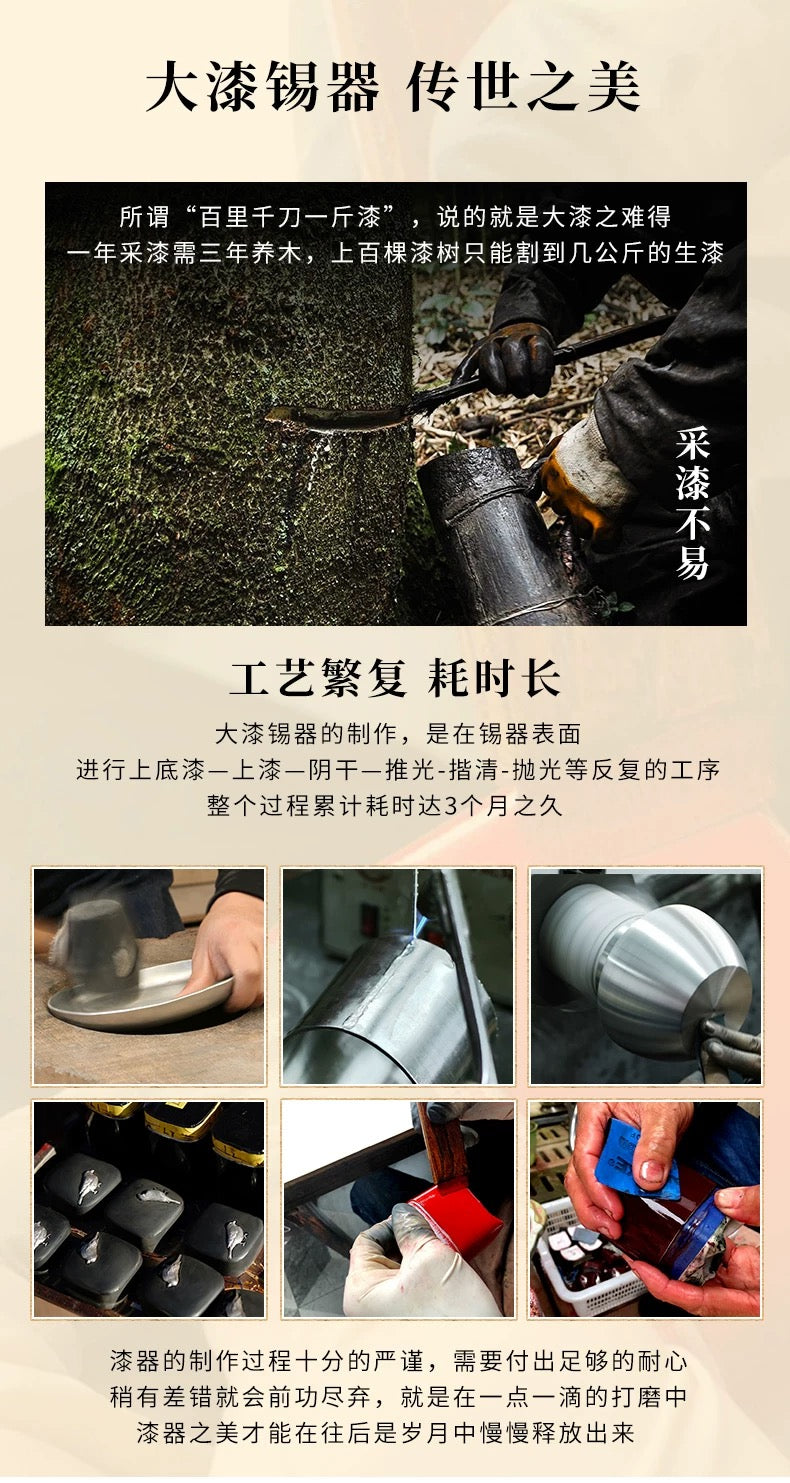 The birth of the Youhuang Tea Caddy is a journey of craftsmanship. The forging of tinware goes through more than 50 processes from design, tin melting, sheet making, to forming, welding, and fine polishing... Every curve and every weld is polished by craftsmen by hand, finally presenting the delicate luster and solid texture of pure tin. The lacquering process follows the repeated procedures of "applying primer - applying lacquer - drying in the shade - polishing - cleaning - polishing", and the entire process takes up to 3 months. Not to mention the rarity of lacquer itself — "a pound of lacquer requires a hundred miles and a thousand knives" — hundreds of lacquer trees can only produce a few kilograms of raw lacquer a year, and every inch of the lacquer surface is a dual gift of nature and human effort. The tea caddy created by such a complicated process has long surpassed the attribute of a "tea storage container" and has become a handcrafted tinware artwork that can be appreciated, collected, and inherited.