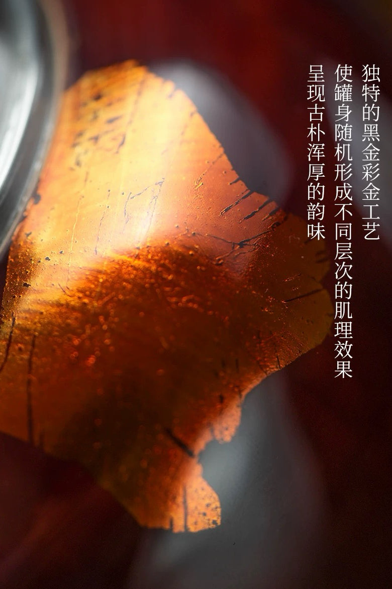 Hailing from Gejiu, Yunnan, this tea caddy is a harmonious blend of traditional lacquer craftsmanship and a pure tin body. Lacquer art, also known as "qi yi," is an intangible cultural heritage of China with a history of thousands of years, and its rarity lies in several key aspects: it uses the natural sap of the lacquer tree as raw material, requiring dozens of layers of painting, sanding, and polishing. Each layer must air-dry naturally in a humid environment, often taking over a month to complete the lacquering process for a single tea caddy. Artisans infuse gold leaf fragments into the reddish-brown lacquer base, and after repeated polishing, the surface develops mottled golden patches that resemble molten sunset gold sinking into a deep pool—each texture is an irreplicable mark of handcraft. Furthermore, the lacquer surface will develop a warm patina over time, nourished by years of handling and body heat, becoming richer in color and a unique "time stamp" that belongs only to you. Held in the hand, the caddy feels as smooth as jade, with the lacquer surface shimmering subtly as light dances across it. Placed on a tea tray, it serves not only as a practical tea storage vessel but also as an elegant piece of Eastern aesthetic decor.