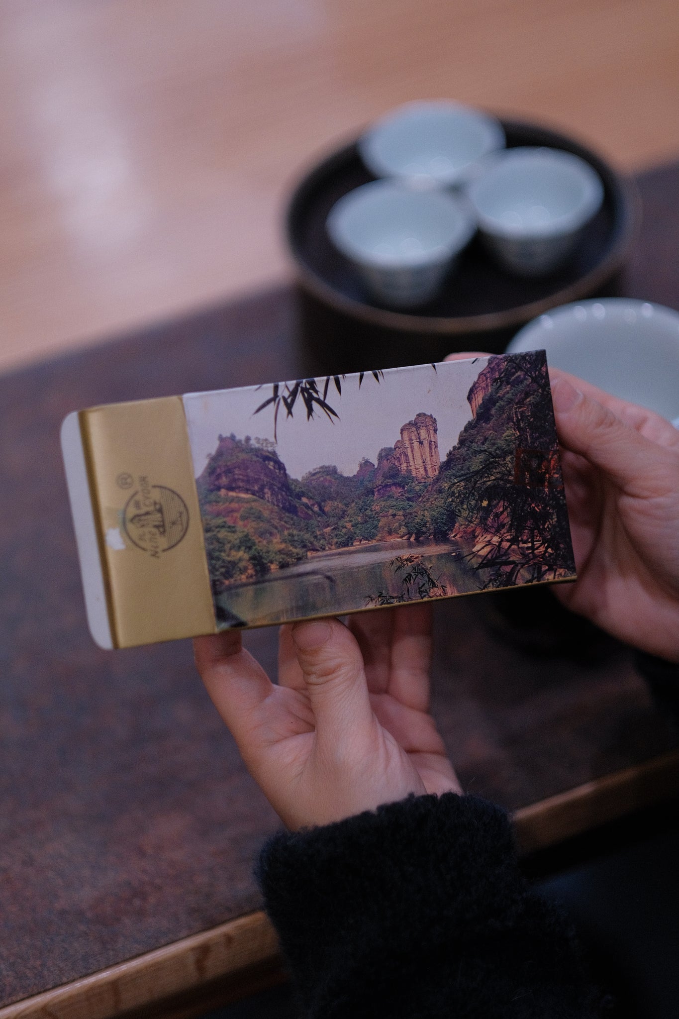 Push open the wooden door of Tongxinshe Teahouse, and warm yellow lamplight spills over the tea table, where an old gilded tea caddy rests quietly. This is our treasured Jiuqu-brand Rou Gui Rock Tea from Wuyi Mountain, aged for more than two decades, with the production date clearly marked June 1998—a witness to the golden age of Wuyi rock tea.